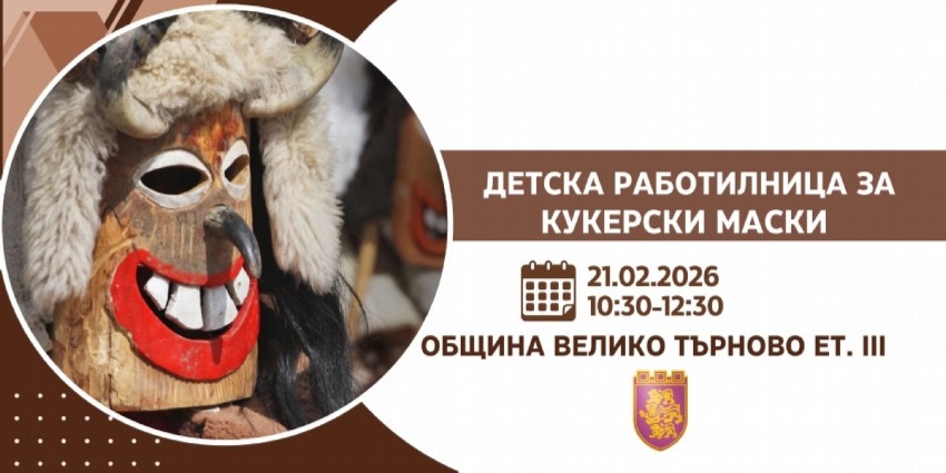 Събитията за Сирни заговезни започват с детска работилница за кукерски маски. Тя се проведе на 21 февруари (събота) от 10:30 до 12:30 ч. на третия етаж в сградата на Община Велико Търново. Децата ще имат възможност да работят с разнообразни материали – кожа, прежда, цветна хартия и декоративни елементи, а майстори от с. Мещица ще им помагат да създадат свои автентични маски. Специален акцент ще бъде присъствието на 12-годишен кукер в традиционен костюм. Децата ще имат възможност да облекат кукерските одежди и да си направят снимка от преживяването. Входът е свободен.