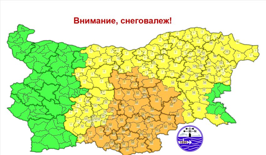 НИМХ обяви жълт код за дъжд и снеговалежи за областите Пазарджик, Ловеч, Плевен, Русе, Търговище, Силистра, Добрич, Варна, Разград, Шумен, както и за някои населени места в областите Бургас, Велико Търново, Пловдив, Сливен и Смолян.