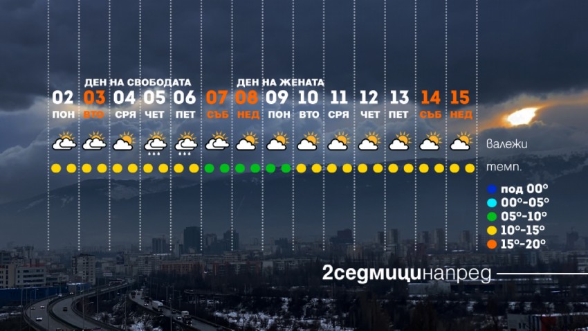 Дневните температури в първата мартенска седмица ще се движат между 10 и 15 градуса, до 17-18 в някои обичайно по-топли точки на страната. Осезаемо по-хладно ще е в районите, където мъглата е продължителна. Захлаждане, макар и не толкова драстично, се очаква около 7-8 март. Дневните стойности на термометрите ще паднат с 2-3 градуса до 8-13.