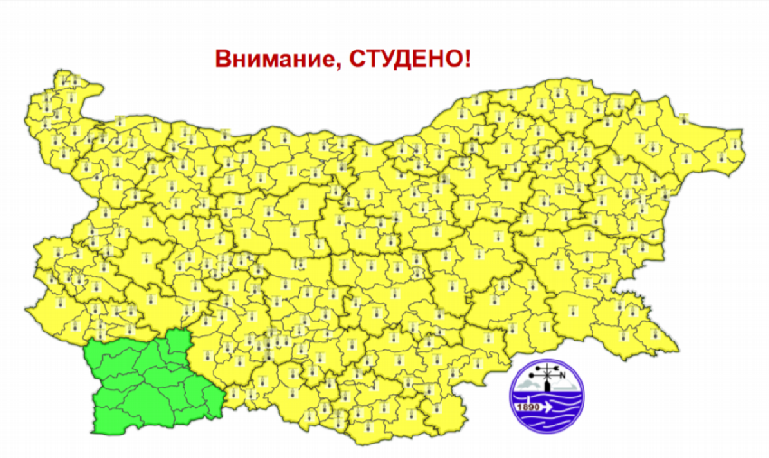 Жълт код за опасно студено време е в сила за всички области на страната с изключение на Благоевград. До минус 14 градуса се очаква да паднат температурите на места в Северна България и високите полета на Западна.