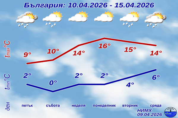 В събота облачността ще се задържи значителна и все още на отделни места, главно в югозападните и планинските райони, ще има валежи. Ще се задържи хладно. Във Великденската неделя и на Светли понеделник ще преобладава слънчево време. Над източните и планинските райони ще има временни увеличения на облачността, но валежи не се очакват. Вятърът ще отслабне. Дневните температури ще се повишат и през втория ден максималните ще бъдат между 15° и 20°.